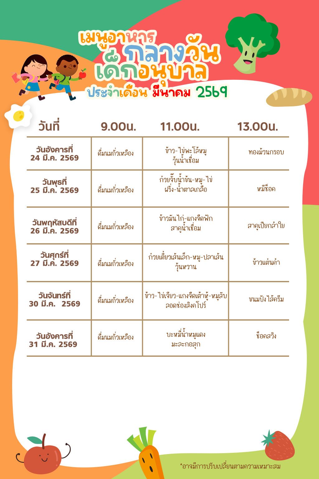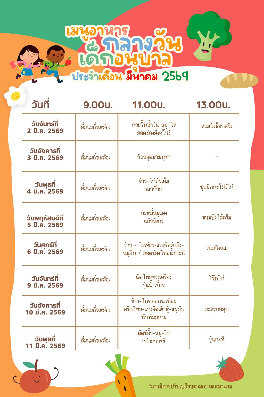รายการอาหารประจำเดือน มีนาคม 2569